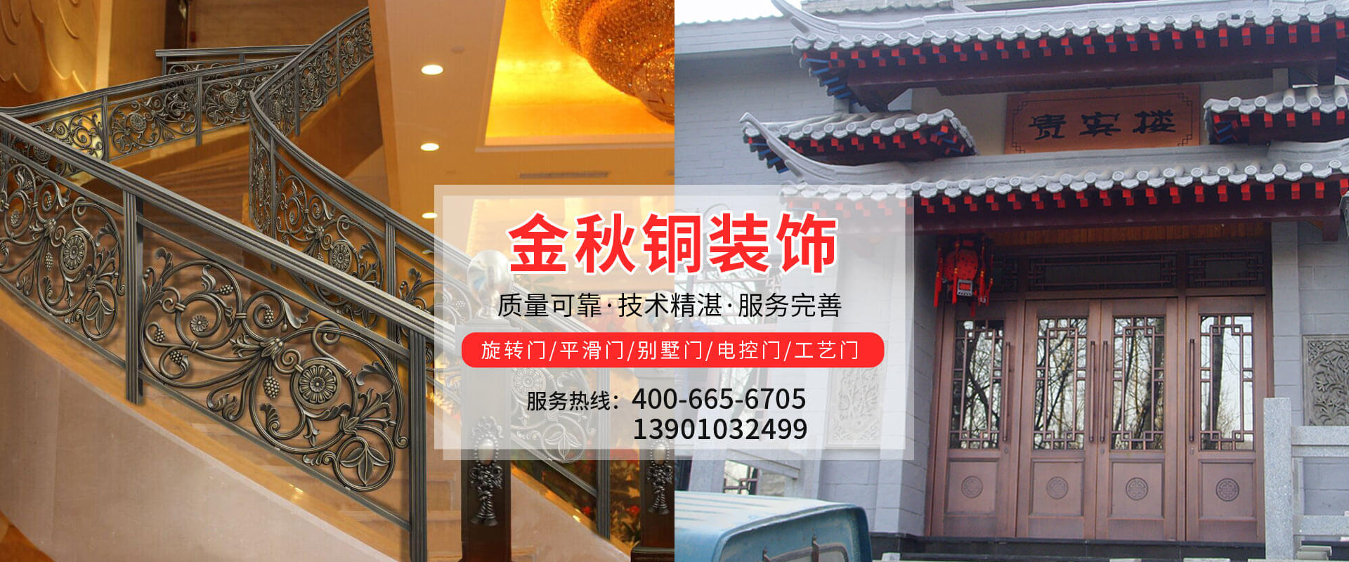 北京金秋銅裝飾材料有限公司是專業生產銅裝飾材料及設計、開發、制造、施工、售后服務為一體的大型綜合企業。可承接建筑銅裝飾工程及五星級酒店、別墅、博物館、樓樘管所等高檔銅裝飾項目;生產各種規格的旋轉門、平滑門、別墅門、電控門、工藝門、旋轉護欄、屋頂銅飾防水瓦、浮雕壁畫......